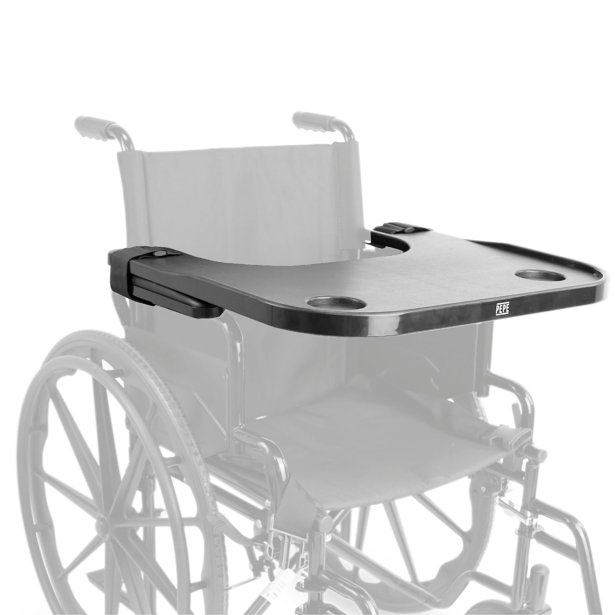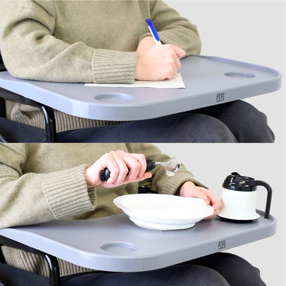 Concebida para adaptarse a la mayoría de los modelos de silla de ruedas, esta bandeja destaca por su portavasos integrado y por estar disponible en dos colores modernos y discretos: negro (P10037) y gris (P10036), combinando perfectamente con cualquier diseño de silla.