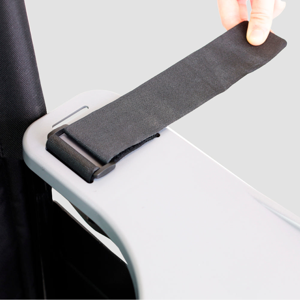 Esta bandeja se instala de forma rápida y segura gracias a sus cintas de velcro ajustables, que se colocan firmemente sobre los reposabrazos de la silla de ruedas. Este sistema de sujeción proporciona estabilidad y comodidad al usuario durante el uso, sin comprometer la movilidad o la estructura de la silla.