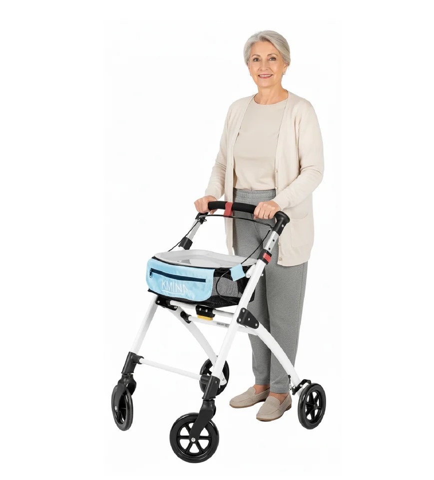 Además de su tamaño compacto, el Andador Estrecho K10009 y K10010 de Kmina incorpora una **bandeja portaobjetos integrada**, perfecta para llevar objetos personales, compras ligeras o elementos de uso diario sin necesidad de una segunda bolsa o soporte adicional. Esta característica lo hace ideal para usuarios que desean comodidad sin renunciar a la funcionalidad.