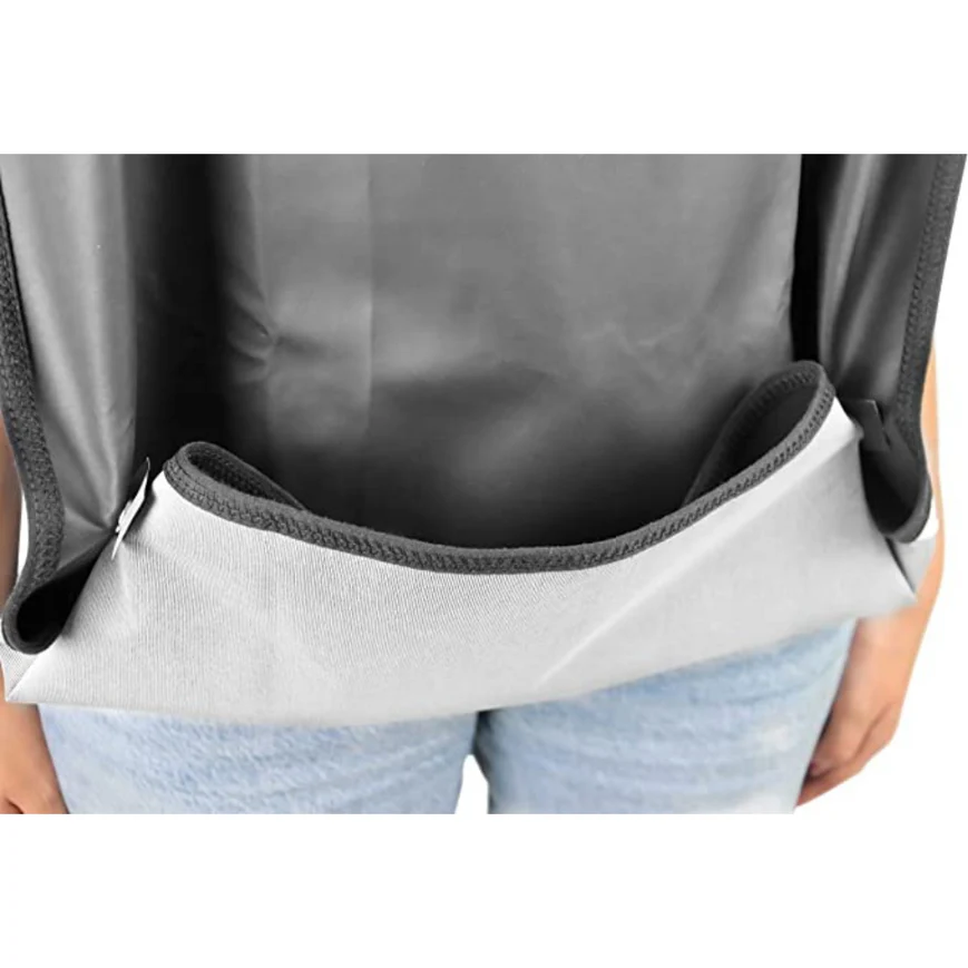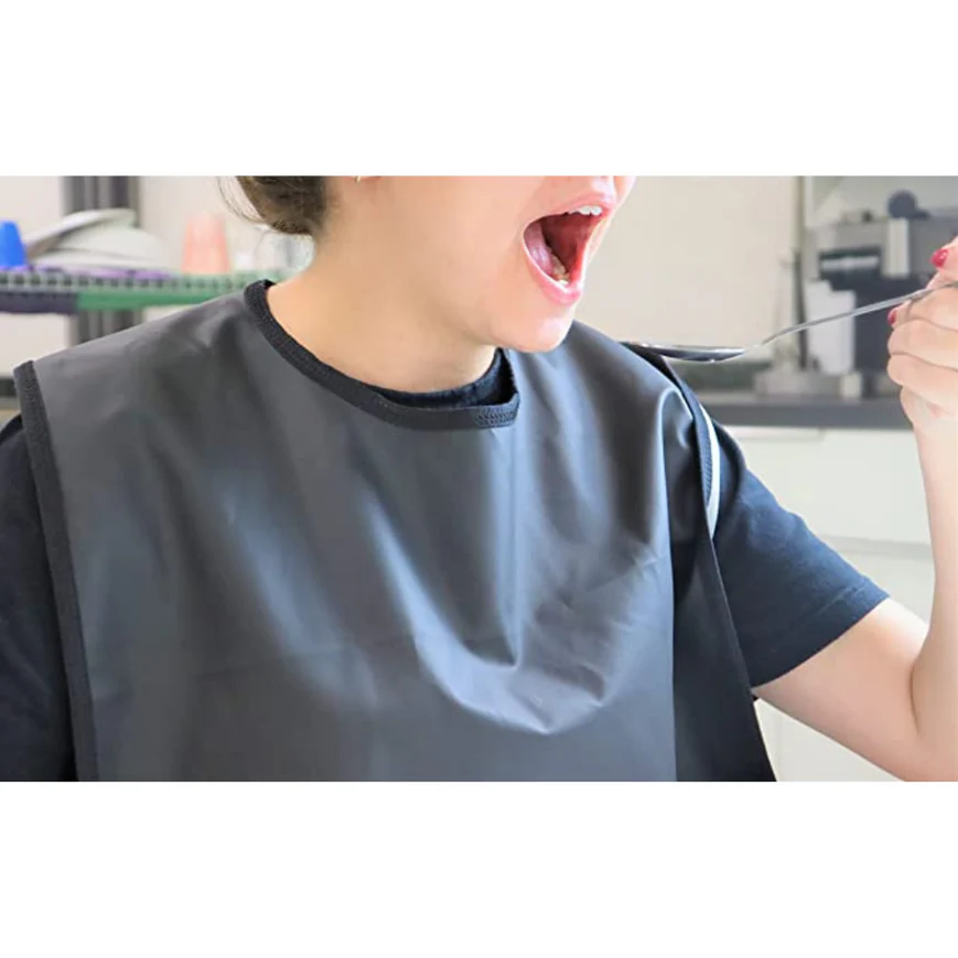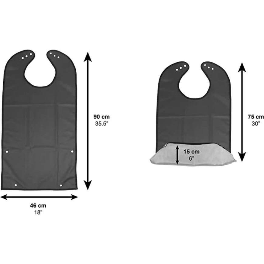 Cada babero cuenta con una gran superficie de cobertura —aproximadamente 46 x 90 cm— que protege eficazmente el pecho y el regazo del usuario durante la alimentación. Gracias a su diseño amplio y práctico, se adapta fácilmente a diferentes circunferencias de cuello y proporciona una barrera eficaz frente a salpicaduras o derrames accidentales.