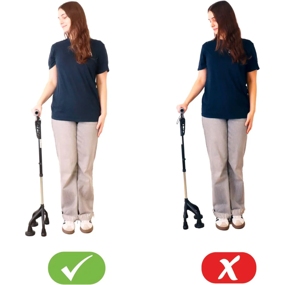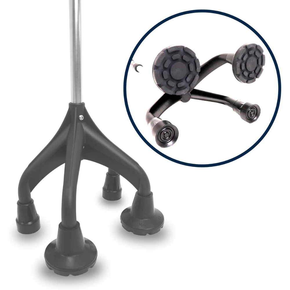 Este bastón con base de cuatro patas se distingue por su soporte ergonómico y diseño robusto, proporcionando un punto de apoyo seguro que mejora significativamente la movilidad asistida. A diferencia de los bastones tradicionales de una sola punta, el diseño de cuatro apoyos garantiza una base más amplia, reduciendo el riesgo de resbalones o caídas incluso en superficies irregulares.