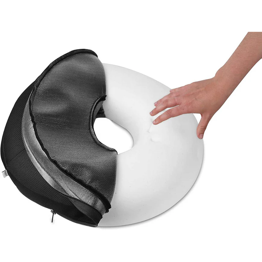 La característica más distintiva del Cojín Antiescaras Redondo con Agujero es su forma circular con un corte central anatómico que libera la presión en zonas delicadas —como el coxis, sacro o perineo— evitando el contacto directo entre la superficie y partes sensibles del cuerpo. Esta configuración es especialmente útil para personas con hemorroides, fisuras, fístulas o molestias en la zona glútea o perineal, mejorando el confort y disminuyendo el dolor al estar sentado.