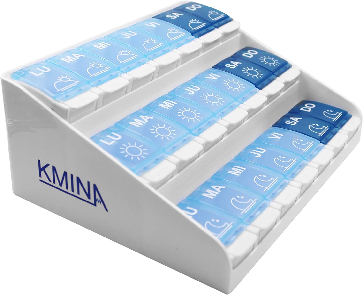 El Pastillero Semanal 3 Tomas cuenta con siete compartimentos principales —uno por cada día de la semana— y cada uno de estos compartimentos está dividido en tres secciones claramente identificadas para las tomas de mañana, tarde y noche. Gracias a esta organización visual, podrás asignar tus dosis de forma anticipada y tenerlas completamente preparadas para cada día, evitando cualquier tipo de error involuntario.