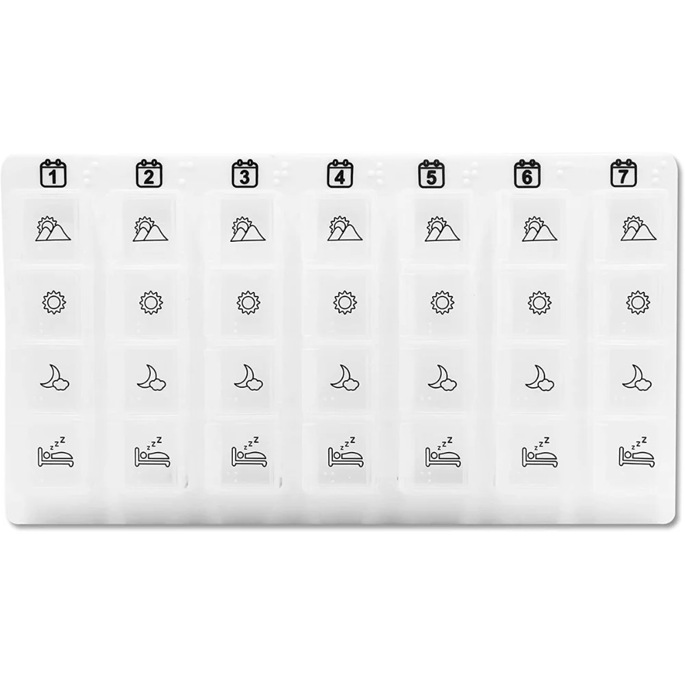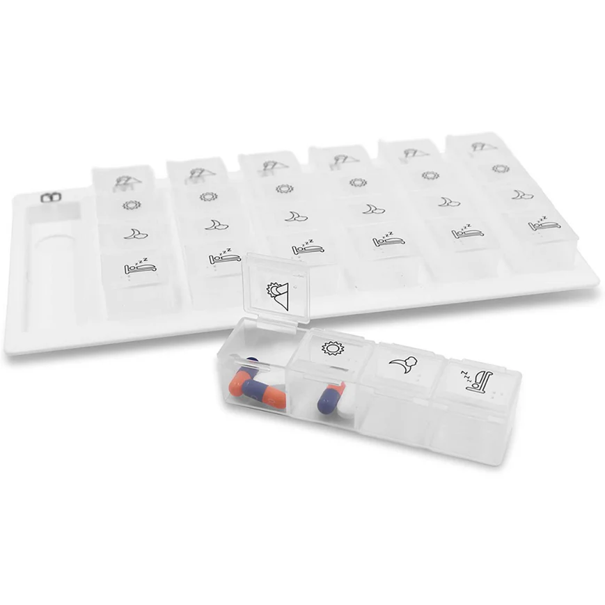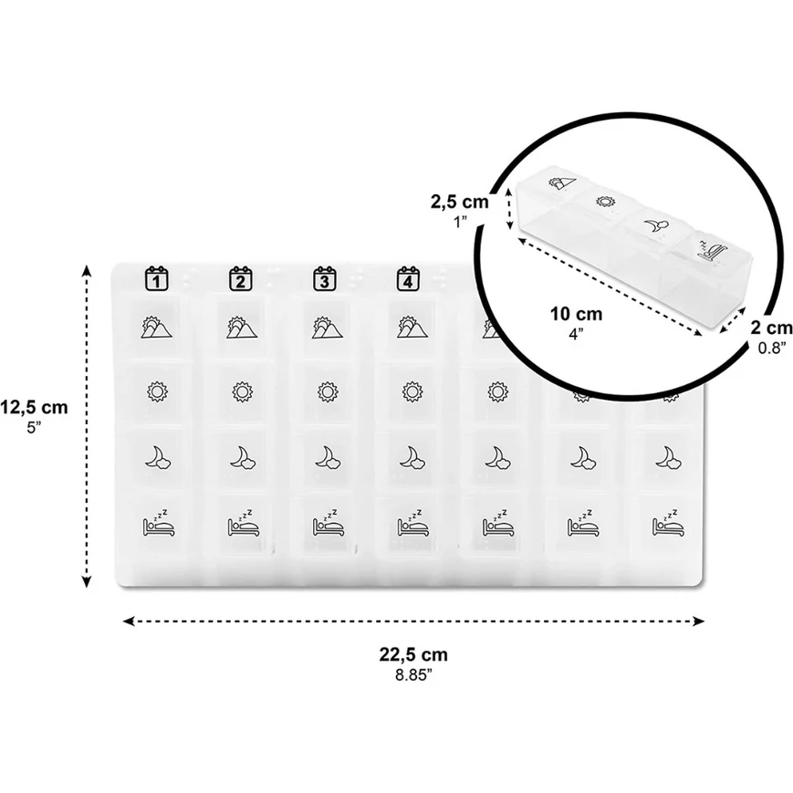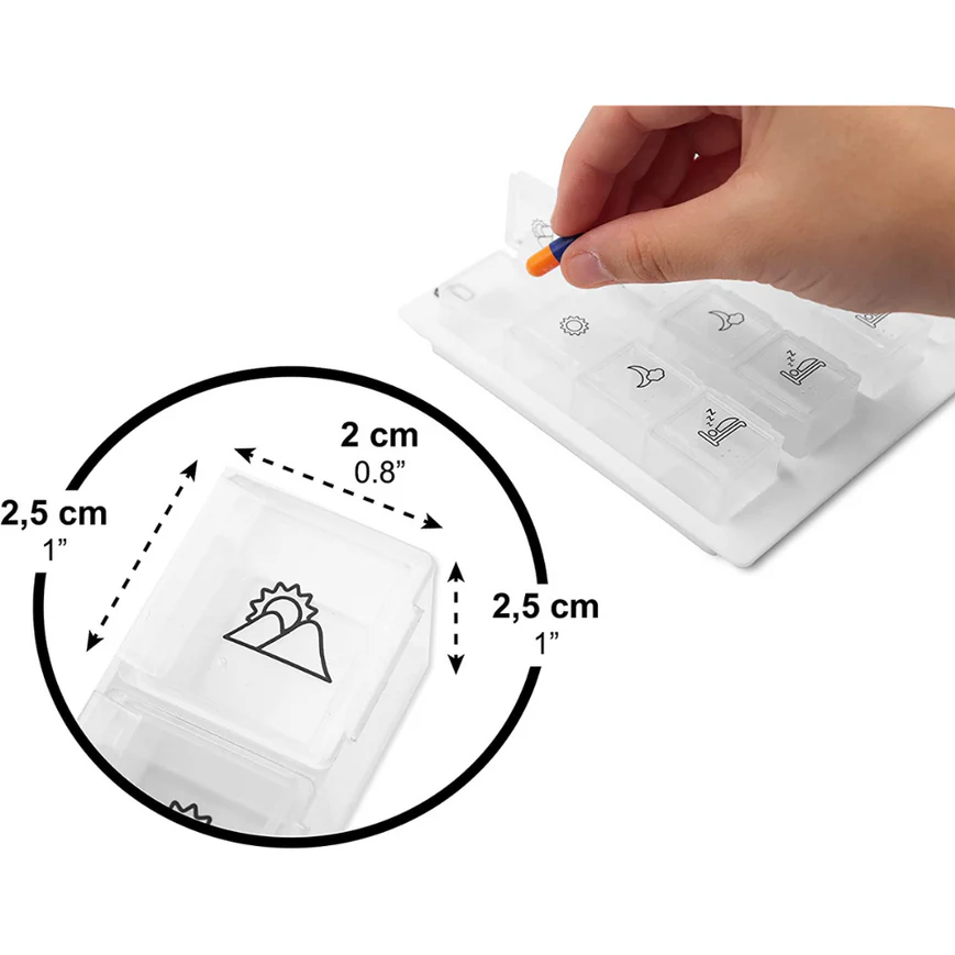 Este pastillero semanal permite dividir y programar las tomas en cuatro momentos del día (mañana, mediodía, tarde y noche) durante siete días completos, favoreciendo la adherencia terapéutica y evitando olvidos que puedan comprometer tratamientos médicos. Su diseño ergonómico y ultraligero facilita el uso diario y la portabilidad, convirtiéndose en un aliado indispensable para la gestión de la medicación en casa, viajes o entornos asistenciales.