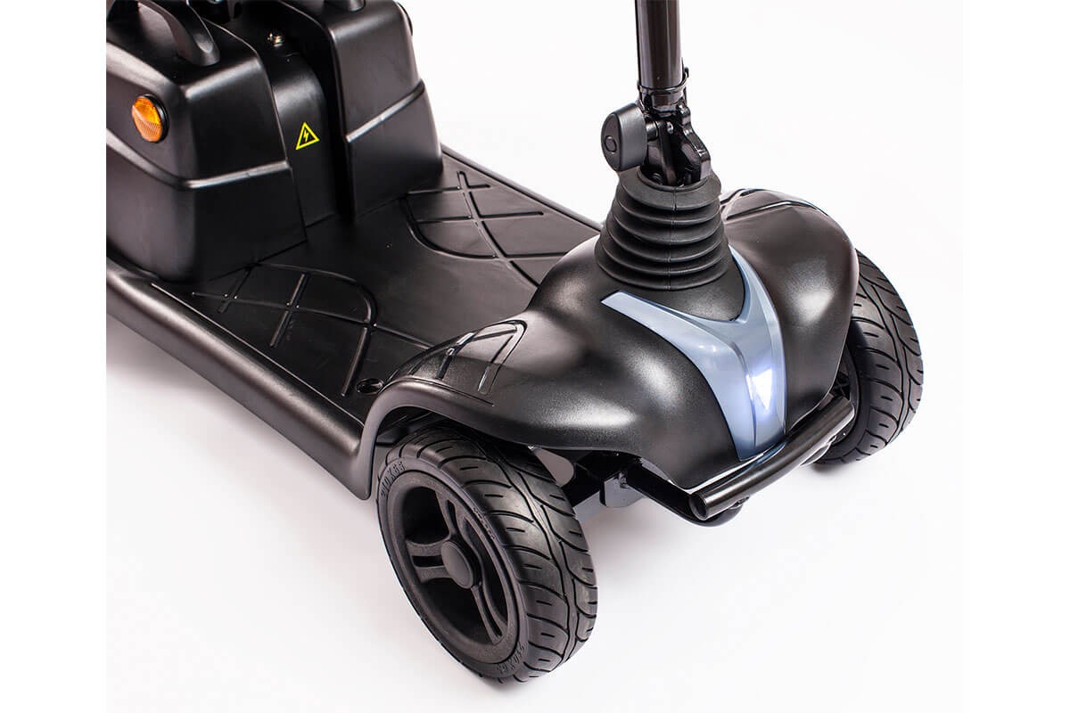 El I‑Nano incorpora ruedas macizas de 8 pulgadas tanto delanteras como traseras, lo que reduce los mantenimientos (sin pinchazos) y garantiza una conducción fiable. Su radio de giro compacto de aproximadamente 115 cm permite maniobrar con facilidad en espacios reducidos. También incluye luz LED delantera para mejorar la visibilidad del usuario en entornos con poca luz.
