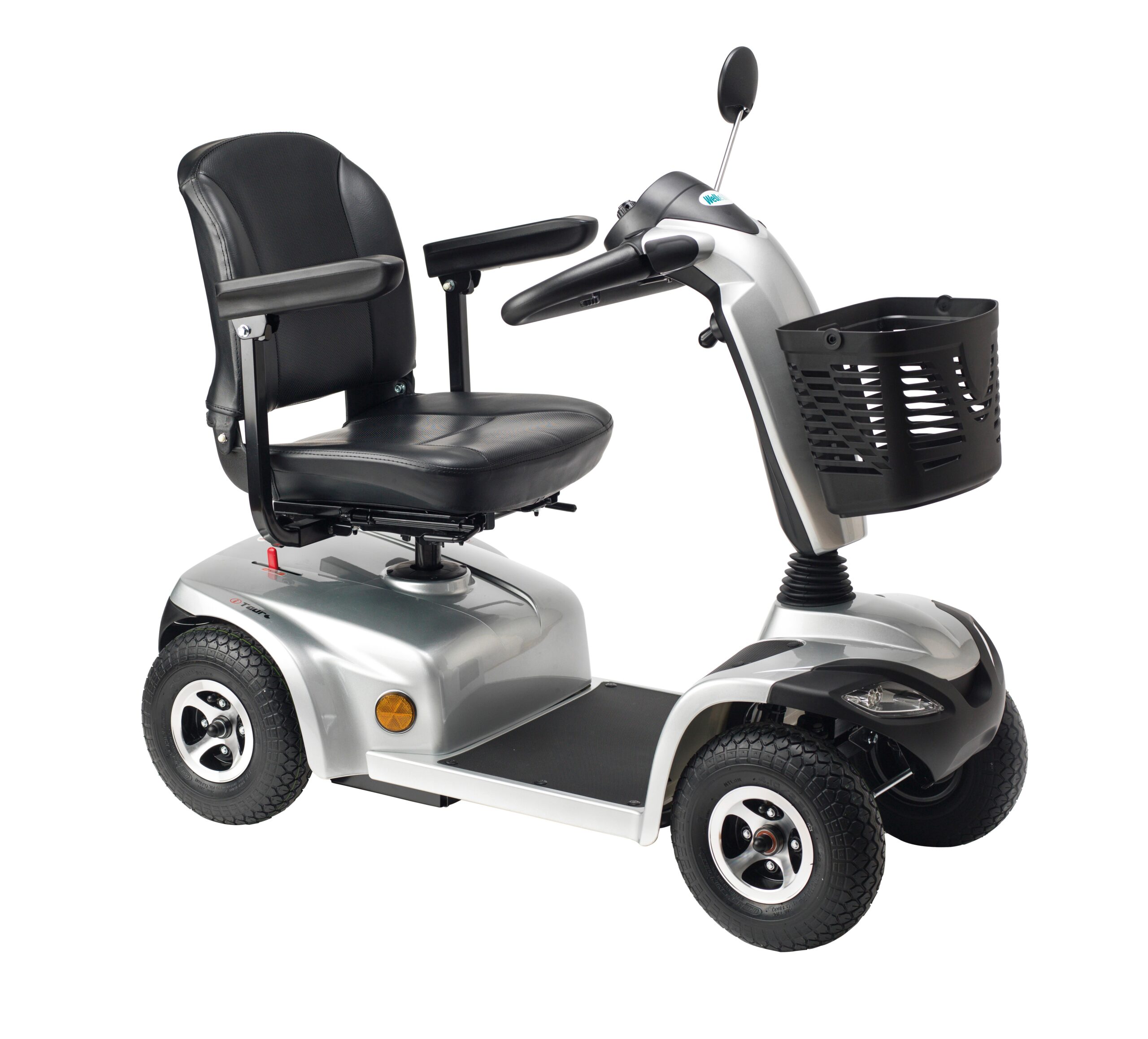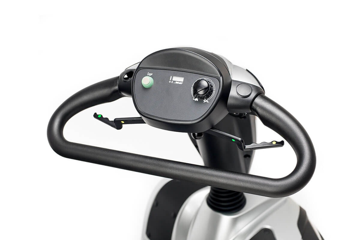 El scooter cuenta con ruedas neumáticas de 11 pulgadas tanto delanteras como traseras, lo que ofrece mayor absorción e incremento del confort de marcha. :Además, su chasis robusto y su carenado protector frente a la corrosión y al agua refuerzan su fiabilidad y durabilidad como ayuda técnica de calidad ortopédica.