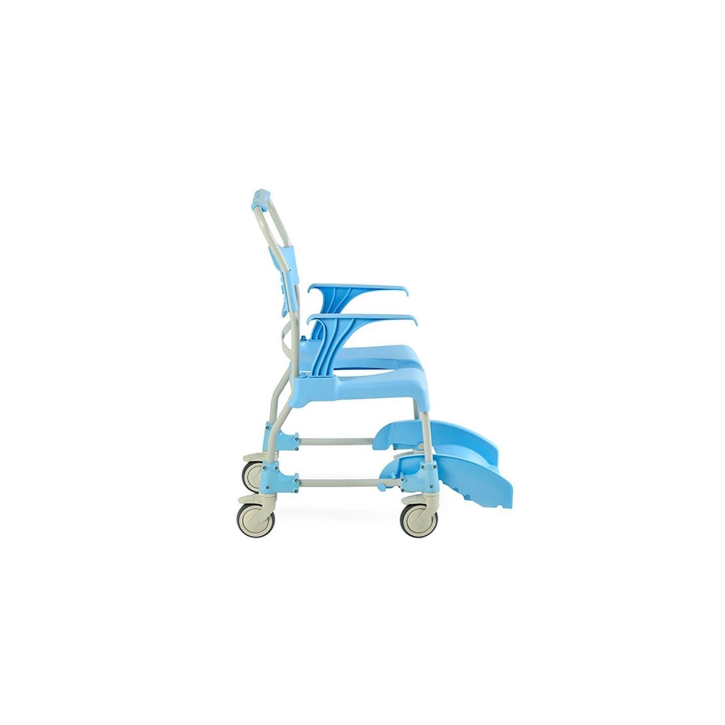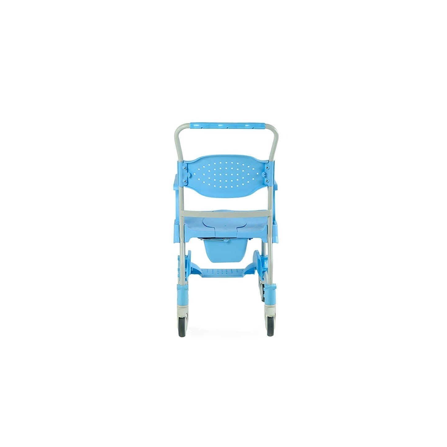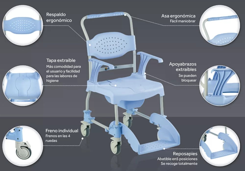 Gracias a su diseño ultraligero y funcional, esta silla es fácil de maniobrar incluso en espacios reducidos. Sus cuatro ruedas con sistema de freno integrado proporcionan una estabilidad y comodidad superior en cada movimiento, mientras que el asiento ergonómico con apertura frontal permite realizar la higiene íntima de forma accesible y segura, reduciendo el esfuerzo físico necesario.