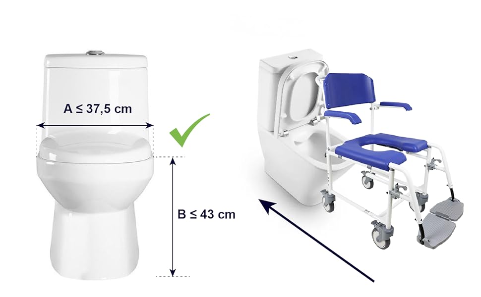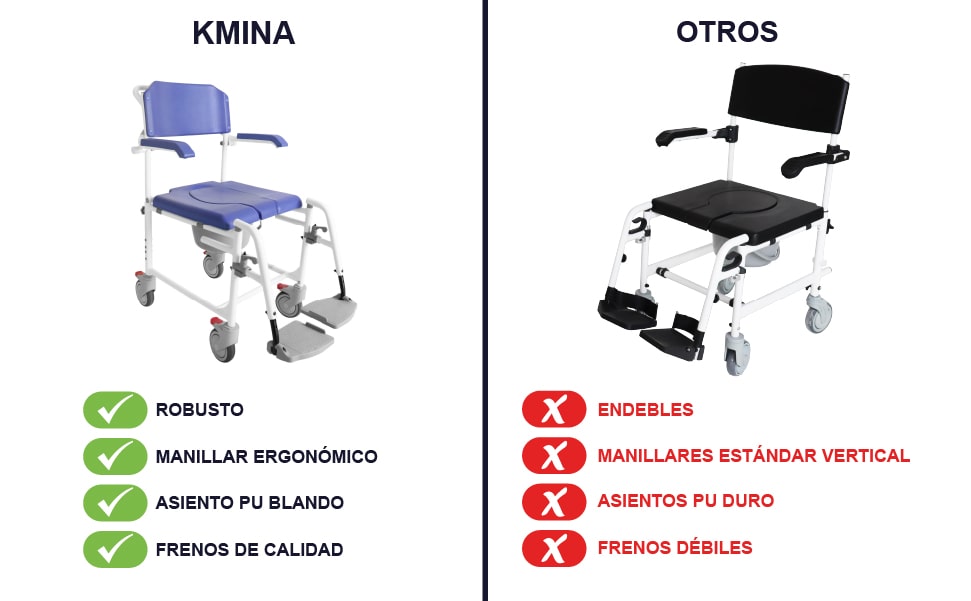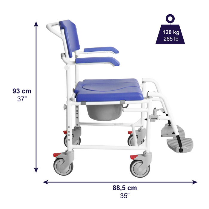 Su sistema de frenado eficaz y estructura ligera hacen que el traslado dentro del baño sea sencillo, mientras que el asiento acolchado maximiza el confort durante la higiene o uso como inodoro portátil.