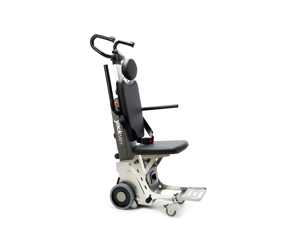 El modelo salvaescaleras Yack 971 incorpora asiento, respaldo, reposabrazos y reposapiés plegables, permitiendo un transporte seguro para el usuario sin necesidad de usar su propia silla de ruedas. Su estructura es desmontable en mástil, columna y base, lo que facilita el almacenaje y transporte. Está pensado para entornos con escaleras rectas o de caracol, tanto en domicilios como en comunidades.